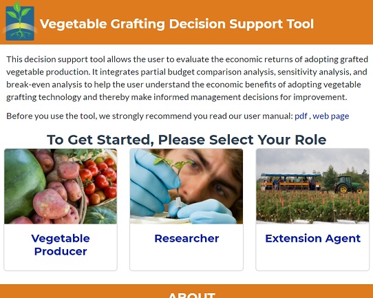 The Vegetable Grafting Decision Support Tool, allows farmers, consultants, extension professionals, and others to analyze the economic costs and benefits of using grafted plants in crop production. Enter information specific to your situation to help determine whether using grafted plants is economically feasible for you. This tool was developed by the Economic Working group of the USDA SCRI-supported Vegetable Grafting Project. Contact Yefan Nian, Zhifeng Gao, and Xin Zhao for information.
